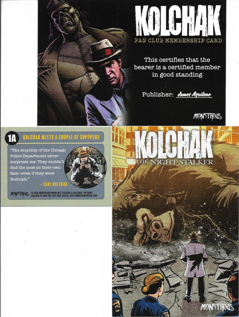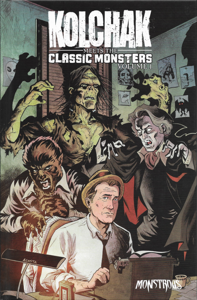 Aquilone, James, editor. Kolchak Meets the Classic Monsters Volume 1. Monstrous Press, 2026. First edition hardback graphic novel, a Fine copy in decorated boards, sans dust jacket, as issued, with three cards laid in. Just what the title says, the latest graphic novel featuring dogged investigative reporter of the supernatural Carl Kolchak. Brought to you by the same people who previously brought you the 50th anniversary edition graphic novel compilation and the first hardback edition of the original Jeff Rice Night Stalker novel. Bought from the Kickstarter for $32.