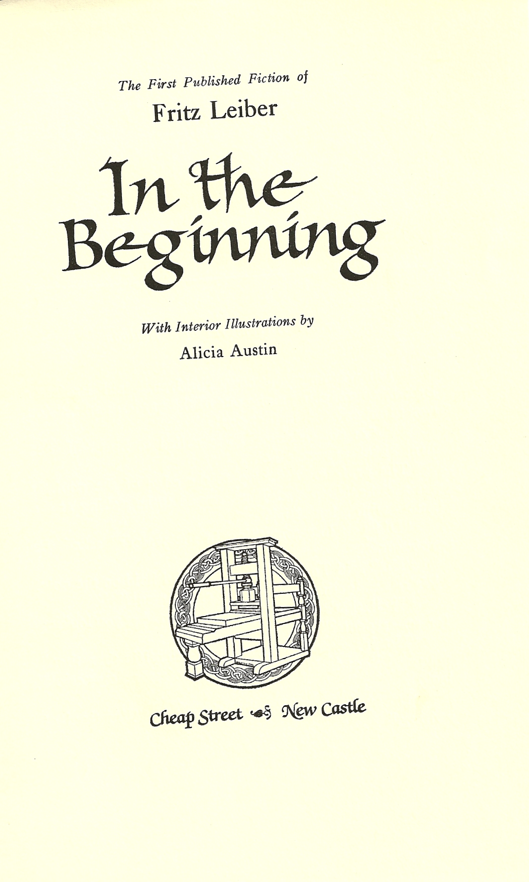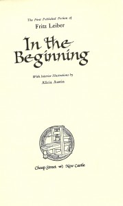 Leiber, Fritz. In the Beginning. Cheap Street, 1983. First edition hardback, #67 of 128 copies of the “Collectors’ Edition” signed by both Leiber and illustrator Alicia Austin (there were also 10 lettered collector’s copies, and 7 lettered and 32 number publisher’s copies), a Fine copy, in full cloth with title labels pasted on front and spine, sans dust jacket, as issued. Chalker/Ownings, pages 106-107.